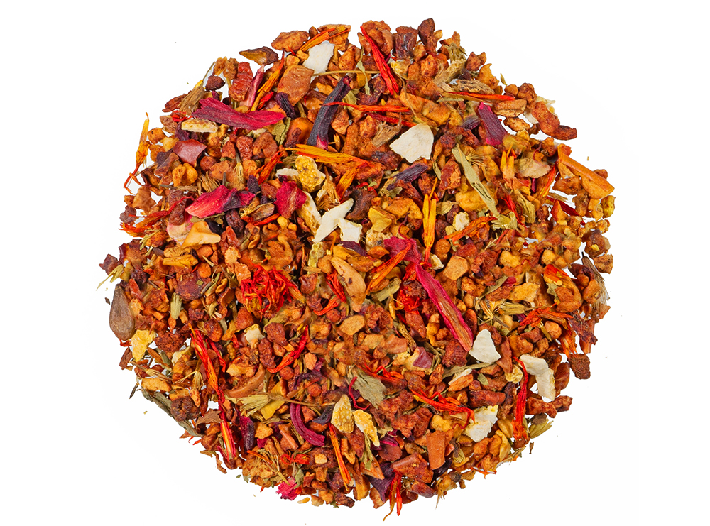 Apfelstücke (Apfel, Säuerungsmittel: Zitronensäure), Orangenschalen(10%), Hibiskusblüten, Süßkraut, natürliches Aroma, Saflorblüten