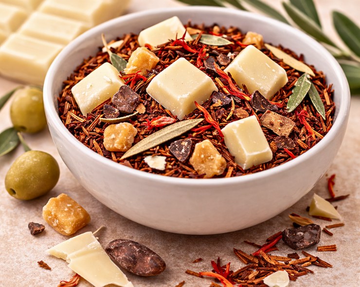 „White Chocolate Olive“ verbindet die warme, weiche Basis eines feinen Rooibos mit einer außergewöhnlichen Aromenkombination aus weißer Schokolade und Olivenblättern. Der natürlich koffeinfreie Rotbuschtee bringt eine sanfte, leicht süßliche Grundlage mit, die perfekt mit der cremigen Note der weißen Schokolade harmoniert.
